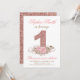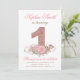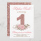 Elégante invitation de 1er anniversaire avec un beau cluster rose et une typographie élégante contre un arrière - plan blanc. Ajoutez simplement les détails de votre événement sur ce modèle facile à utiliser pour en faire une invitation unique. Retournez la carte pour révéler une texture de parties scintillant d'or faux rose au dos de la carte.