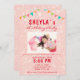 Parties scintillant rose mignonne Fille Anniversaire Fête Photo Invitation. Belle et amusante invitation d'anniversaire pour une fille. Le design a de beaux drapeaux colorés de bunting sur un arrière - plan parties scintillant rose. Personnalisez tout le texte de l'invitation et insérez votre photo dans le modèle. Ce design joyeux peut être utilisé pour différents âges.