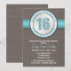 Sweet sixteen bleu aqua personnalisé (16) jalon Anniversaire Invitations avec une illustration de parties scintillant imprimée pour le "16" dans un design d'emblème "SWEET SIXTEEN CÉLÉBRATION", sur une image rustique de texture de toile gris foncé.