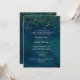Cette suite de faire-part de mariage élégante et moderne possède un arrière - plan d'aquarelle turquoise foncé avec une diffusion de faux éclats de parties scintillant dorée en cascade du haut et du texte blanc.