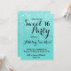 Une douche à parties scintillant moderne, assez fausse turquoise ombre avec bloc de couleur turquoise pastel Sweet 16 anniversaire invitation avec parties scintillant turquoise ombre motif s'estompe sur un arrière - plan turquoise. Parfait pour un Sweet sixteen princesse, parfait pour elle, la fashionista qui aime motif moderne et glam