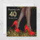 Noir et or entrant dans l'invitation de fête de 40 ans avec des jambes élégantes et des chaussures de talon rouge sur un bel arrière - plan de parties scintillant noire. Vous pouvez facilement customiser cet élégant noir et or qui entre dans l'invitation de fête de 40 ans pour votre événement en ajoutant simplement vos détails dans le style de police et de couleur, et le libellé de votre choix. Vous pouvez également modifier la couleur de l'arrière - plan. Il s'agit d'un design imprimé sans véritable diamants, bijoux, parties scintillant, etc.