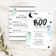 Un Baby shower Halloween pas si éffrayant ! Pastel bleu et vert, A Little Boo est sur le chemin Baby shower Halloween avec un design spécial dos qui comprend Diaper Raffle et Livres pour bébé sur un arrière - plan rayé noir et blanc.