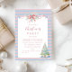 A pastel Christmas invitation featuring watercolor pink and blue stripes, a festive bow, and a decorated Christmas tree with gifts beneath. The soft candy-colored palette creates a sweet and cheerful holiday mood, perfect for elegant yet playful celebrations.