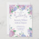 Faire-part de mariage florale Pastel Hydrangeas aux tons mauve, bleu et rose, sur un arrière - plan blanc. Le texte avant comprend : Le nom de la mariée et de la chambre, la date, l'heure, l'emplacement et l'adresse. Le texte inverse comprend : votre emplacement de réception et les détails, sur un arrière - plan mauve doux avec du texte blanc, et Hydrangeas Bouquet. Pour personnaliser cette invitation, insérez simplement vos détails dans notre modèle facile, en remplaçant l'exemple de texte. Assurez-vous de voir la collection de Mariages Pastel Hydrangeas complète pour les cartes et accessoires correspondants.