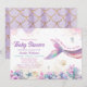 Inspired by shimmering coral reefs and dreamy seaside sunsets, this mermaid invitation blends blush pink, lavender mist, aqua tones, and delicate gold accents. The flowing rainbow tail creates a magical focal point, setting the scene for a sweet and elegant under-the-sea celebration for your little mermaid.