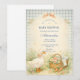 A charming storybook-style baby shower design featuring a sweet watercolor goose standing beside a nest filled with pastel eggs. Delicate spring flowers and soft greenery create a gentle countryside scene, while a blush bow and sage gingham background add a cozy cottagecore touch. The vintage illustration style and soft pastel palette give this design a whimsical nursery feel, perfect for a playful and heartwarming baby celebration.