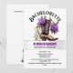 Une botte de cow-boy marron en cuir à outils contient des fleurs violettes et de la verdure, ainsi qu'un élégant verre de flûte à vin pétillant et un cocktail de martini, reposant sur une bande horizontale en argent clair imitation. Il y a des modèles noirs et lavande modifiables sur un arrière - plan blanc foncé qui peuvent être personnalisés pour convenir à votre occasion spéciale. Cet invitation téléchargeable élégant est idéal pour une soirée de bachelorette à thème occidental, "bottes et bling" ou "bottes et mousseux"; douche nuptiale; anniversaire ou événement spécial.