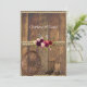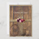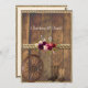 Joli faire-part de mariage rustique avec bois de grange, roses roses roses et rouges, plumes, corde, bottes, et une vieille roue de wagon. Ajoutez vos noms et informations de personnaliser mariage.