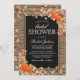 Invitations de douche nuptiale moissonneuse rustique avec un arrière - plan en bois chic, pièce centrale en damier noir, corde, citrouilles halloween, feuillage d'automne, glands, un éparpillement de feuilles d'automne, lumières scintillantes à cordes et un modèle de texte personnalisé.