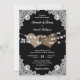 Mariage campagnard rustique noir avec deux coeurs de burlap, des lampes à cordes et de la dentelle florale blanche. Un design de carte parfait pour votre mariage rustique noir.