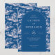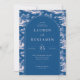 Cette élégante invitation de mariage présente un design d'inspiration vintage avec une palette de couleurs bleu marine profond, créant un look sophistiqué et intemporel. La mise en page est orientée verticalement, encadrée par des illustrations complexes de paysages luxuriants et d'éléments architecturaux qui ajoutent une touche de charme classique. La forme ovale centrale met en évidence le texte principal dans une police serif propre, assurant la lisibilité tout en maintenant une atmosphère de formalité. Parfaite pour les couples recherchant une esthétique raffinée et traditionnelle, cette invitation donne le ton pour une célébration mémorable.