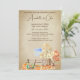 Cette faire-part de mariage romantique d'inspiration automnale présente une image aquarelle d'un paysage d'automne. Des arbres aux couleurs chatoyantes jaune et orange créent un auvent sur une clôture de ferme en bois. Trois citrouilles et une corbeille de pommes sont placés devant la clôture, sur un tas de feuilles. L'arrière - plan est décoré d'un papier parchemin rustique.