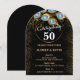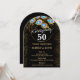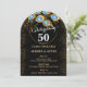 Élégante invitation 50ème anniversaire mariage noir et or avec anneau d'or et plumes paon, changez tout le texte vous-même à tout anniversaire ou occasion.