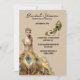 Une belle dame aux cheveux longs qui descend sur l'épaule gauche porte une robe de boule en plumes de paon doré et une tiare en plumes et perles pour se marier. Une seule fausse chaussure à talon haute en or apparaît à côté de l'oreille et ils sont mis contre un arrière - plan de crème pastel dusky qui a des modèles noirs personnalisés sur elle pour votre libellé personnalisé. Cette invitation à la "douche nuptiale" est idéale pour tout événement musulman, islamique, hindou, indien, nature, oiseau ou extérieur.