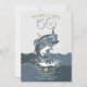 Idées de 50ème anniversaire pour les hommes : une invitation à la fête du 50ème anniversaire sur le thème de la pêche, avec le numéro 50 en gros caractères et une illustration d'un poisson sautant hors de l'eau, portant un casquette de fête et avec une bougie d'anniversaire sur la tête. Couleur gris bleu et jaune or. Une invitation moderne et élégante à la fête du 50e anniversaire pour votre mari, petit ami, partenaire, grand-père, oncle etc.