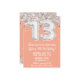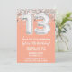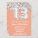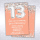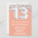 Peach argent et blanc 13th Birthday invitation 13 anniversaire fête invitation pour un noir blanc argent avec l'écriture de script moderne et des ballons de papier amusant.