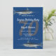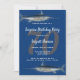 Thème de pêche, invitation de fête d'anniversaire pour mâle adulte. Les images d'espadon en haut et en bas à l'avant, et les barres de pêche à l'arrière, décorent les cartes bleues foncées avec du texte personnalisé gris. Son âge est gris foncé et fait partie de l'arrière - plan. Cela peut être créé pour une fête surprise, ou pas. Choisissez de mettre à niveau le papier et de recevoir des rabais pour les commandes en vrac.