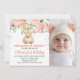 Pêcher Lapin Floral Photo 1er Anniversaire Invitation Bébé mignon et ballon invitation de premier anniversaire pour une petite fille. Ce petit lapin tourne une invitation d'anniversaire avec un arrangement floral en points de parties scintillant blush et pêche et faux or.