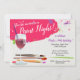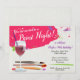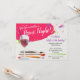 Célébrez une occasion spéciale ou juste une nuit de dames avec une peinture et sirotez la partie. Cette invitation comporte un arrière - plan blanc de toile avec les courses et les flocs lumineux de peinture. Un verre de vin avec un pinceau de manière erronée placé dans les supports du côté droit entourés par quelques pinceaux. Assez souple pour une fête d'anniversaire, une douche nuptiale, une partie de bachelorette ou toute nuit qui réclame se réunir avec des amis pendant une nuit de peinture. Disponible avec les produits assortis.