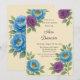 Un design faire-part de mariage étonnant qui présente d'élégantes pivoines bleu Lyons associées à des roses violets Fig et à une végétation douce. La palette de couleurs audacieuse et romantique rend ce design idéal pour les couples à la recherche d'un thème floral unique et intemporel. Parfait pour les mariages.