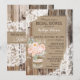 Le design rustique de la carte de douche nuptiale chic avec des pivoines en bocal de mason avec burlap et dentelle attachée en dentelle blanche et twine sur des planches de grange.
