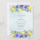 This watercolor design features bright yellow lemons nestled among periwinkle blue anemones and lush green foliage. The soft sky blue wash background creates a serene and fresh atmosphere for a Mediterranean-inspired summer event. Delicate botanical illustrations decorate the design with a vibrant, nature-inspired palette.