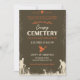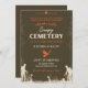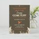 L'invitation présente un design minimaliste avec un arrière - plan brun lave foncé et des accents blanc perle et orange carotte. La disposition est simple et propre, le texte centré et les graphiques disposés symétriquement. L'ensemble est éffrayant et sinistre, le contraste entre l'arrière - plan sombre et les éléments plus légers créant un sentiment de profondeur et de mystère. L'utilisation d'un crâne, de chauves-souris, d'un corbeau et de zombies ajoute à l'atmosphère déplaisante.