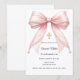 Un fond blanc, orné d'un grand ruban rose avec perles et une croix dorée. Personnalisez et ajoutez un nom et des détails détails.