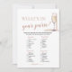 Le Jeu de sac à main élégant Perles Modernes & Prosecco est un ajout charmant à vos festivités de douche de mariage. Avec des motifs sophistiqués de perles et de prosecco, ce jeu invite les invités à explorer leurs sacs et à comptabiliser les points pour les articles qu'ils ont sous la main. C'est une façon amusante et interactive de briser la glace et de faire participer tout le monde, créant des souvenirs durables pour la future mariée et ses invités.