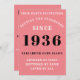 For those born in 1936 and celebrating their birthday party we have the ideal birthday invitation card. The pink background with a white and black design is simple and yet elegant. Easily customize the text to the front and the rear of this birthday invitation card using the template provided. Part of the setting standards range of cards, party supplies and gifts.
