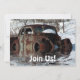 Amusez-vous pour une retraite ou une fête d'anniversaire. Une voiture vintage classique rouillée collée dans l'eau lors d'une journée d'hiver enneigée.