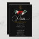 Une invitation à la douche nuptiale "Petals and Prosecco", élégante et moderne, avec un thème sombre et moody, avec des roses d'aquarelle rouge et blanc comme pièces centrales avec une touche d'haleine pour bébé, ainsi que de la verdure, et deux flûtes de champagne en or stylisées (pas d'or véritable, c'est un effet numérique), couplée à une calligraphie moderne avec des parfums élégants.