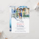 Peter rabbit thème d'hiver fête d'anniversaire modèle invitation téléchargement numérique, un lapin mignon dans une veste bleue devant un chalet d'hiver enneigé pour les fonctions hivernales.