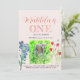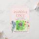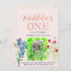 Invitation avec un petit agneau et des fleurs sauvages colorées. Un heureux collage de peintures à l'aquarelle pour la petite qui célèbre son premier anniversaire.