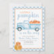 Un petit citrouille est sur le chemin baby shower invitation avec citrouille aquarelle et camion bleu clair et plaid bleu.