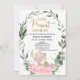 Invitation Baby shower d'éléphant Pink Floral Little Peanut Invitation baby shower fille douce avec un joli éléphant, une couronne de feuillage et quelques fleurs roses. Cette petite cacahuète est sur le chemin de l'invitation de baby shower avec également un titre décoratif faux or, des points et des étoiles.