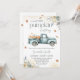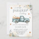 Invitation baby shower d'automne avec un design rustique incluant un pick-up camion, citrouilles et feuilles d'automne.
