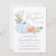 Un petit garçon mignon saupoudré d'invitation avec "un petit citrouille sucré est en route" écrit en typographie bleue et un script gris doux et élégant avec un coeur gonflé, et un bouquet d'aquarelle d'un citrouille bleu pastel, fleurs orange et verdure. Personnalisez le nom de la mère en caractères bleus et les détails de la douche dans une simple typographie gris-doux.