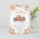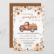 Invitation baby shower d'automne avec un design rustique incluant un pick-up camion, citrouilles et feuilles d'automne.