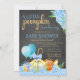 Garçons petites invitations de douches bébé citrouilles avec de jolis citrouilles bleu et orange et or et ballons sur un arrière - plan de tableau noir à pois fleuris bleu avec texte bleu et or. Vous pouvez facilement customiser cette adorable petite invitation de baby shower citrouille pour votre événement en ajoutant simplement vos détails. Il s'agit d'un dessin imprimé sans véritable feuille, arcs, etc.