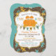 Aqua, or, et chêne brun feuille imprimé arrière - plan avec bordure en parties scintillant or et en vichy chèque bleu aqua avec banderole à banderoles et petit citrouille jumeaux garçons automne baby shower modèle de carte d'invitation.