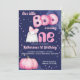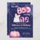 Petit boo Halloween mignon bébé fille fantôme fête d'anniversaire modèle invitation instantanément télécharger. Un mignon fantôme de bébé avec un arc-en-ciel rose aquarelle citrouille sur un arrière - plan de nuit étoilé foncé pour la fête d'anniversaire d'Halloween.