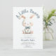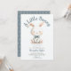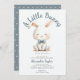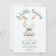 Une illustration d'aquarelle enchanteresse avec un garçon lapin précieux portant une cravate arc décorent cette délicate invitation à la douche pour bébé garçon avec un coloris bleu et blanc poussiéreux, qui est parfait pour une fête du printemps, des événements de Pâques, une fête du jardin d'été, ou un charmant baby shower à thème pique-nique.