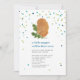 Thème baby shower de poule nugget avec aquarelle inspiré de l'illustration d'un nugget avec feuilles arugula. Le texte bleu dit, "un peu de nugget sera ici bientôt" entouré de confettis. l'envers est bleu.