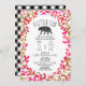 Invitation baby shower illustrant une silhouette d'ours entourée d'un texte personnalisé avec une bordure de verdure rose. Le dos est recouvert de buffle noir et blanc.