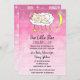 Une petite fille caucasienne douce dormant sur un nuage entouré de coeurs et d'étoiles, invitation à la douche de bébé fond rose.