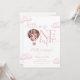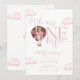 Cette invitation à la première fête d'anniversaire charmante comporte une montgolfière photo hot air et des nuages roses, ainsi qu'une typographie élégante. Conçue par Thisisnotme©