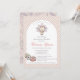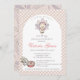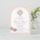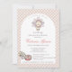 Baby shower d'automne et d'action de grâces Invitation pour une petite fille. Dispose d'une jolie dinde de petite fille dessinée à la main et d'une tarte sur un adorable arrière - plan en vichy. Le dos est imprimé avec un motif de plumes en vichy épars.