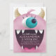 Jolie invitation à la fête d'anniversaire pour la petite fête monstre de votre enfant! Illustration d'un monstre rose à un oeil avec deux cornes ouvrant la bouche. Les textes sont à l'intérieur de la bouche avec le nom de la fille d'anniversaire, l'âge et les informations de fête. Les textes sont facilement modifiables en ligne. Parfait pour célébrer l'anniversaire d'un tout-petit.